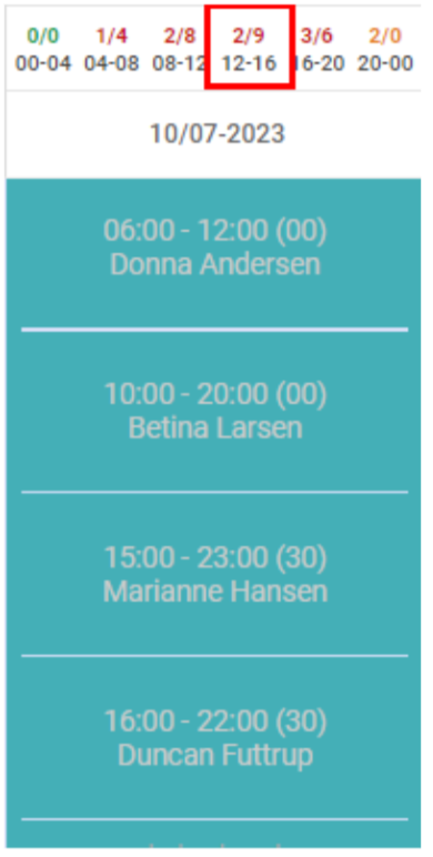 - Orange, hvis der findes flere planlagte vagter, end der er behov for (overplanlagt), fx 3/1