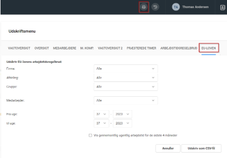 Du kan trække rapporterne i LessorWorkforce ved at trykke på print ikonet i øverste bjælke. Dette kræver rettighed #9650