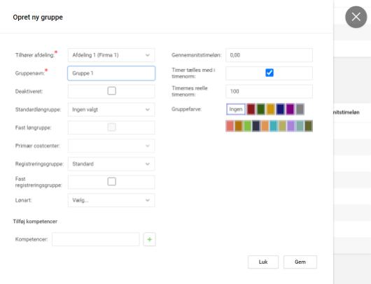 | Gruppe farve | Her kan du vælge en farve på gruppen. Gruppen vil herefter blive vist i den valgte farve bl.a. under Skemaplanlægning/Ganttplanlægning. |