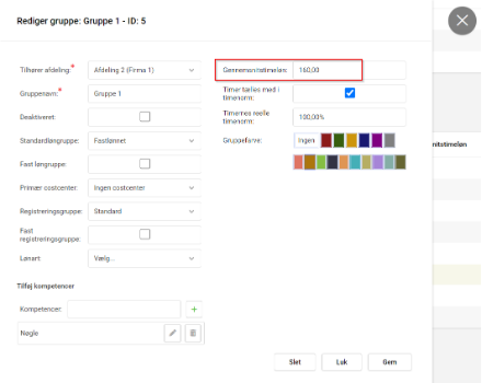 | Timernes reelle timenorm | Hvis timerne i denne gruppe skal vægtes, kan du angive en afvigende faktor i forhold til 100%, hvilket svarer til at 1 times arbejde vægter med 1 time. |