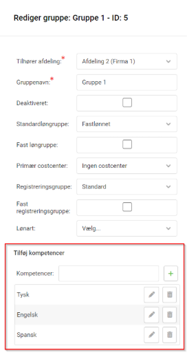 I Feltet Kompetencer udfylder du kompetencen for gruppen i klar tekst, gem ved tryk på knappen: Tilføj ny. Det indtastede vil blive gemt og vist under feltet. Efterfølgende kan man ændre i teksten eller slette kompetencen. Når du har oprettet kompetencerne på gruppen, kan du tildele dem på medarbejderens stamkort under fanebladet: Grupper/kompetencer.