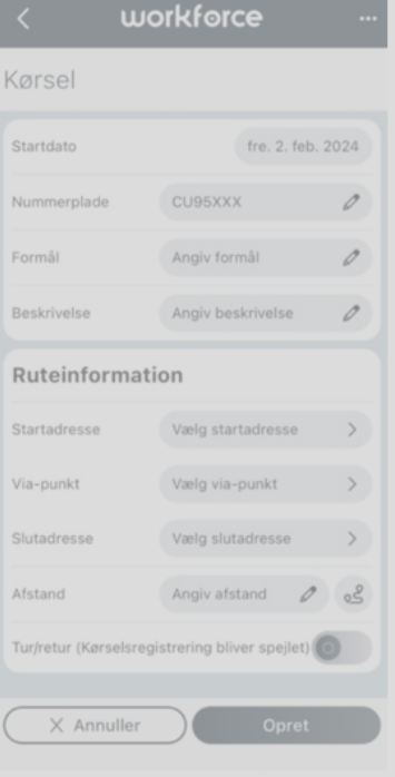Med rettigheden #32500 vil medarbejderne kunne se, oprette og redigere kørselsregistreringer via Workforce app.