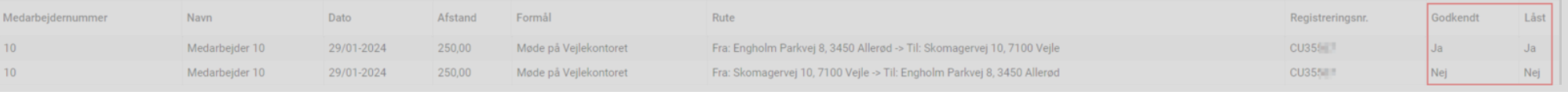 Det er ikke muligt at redigere eller slette godkendte og/eller låste kørselsregistreringer.