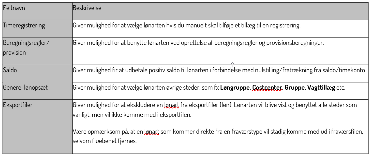 | Lønart | A | 50 | A/N | Obligatorisk felt – kan kun oprettes, kan ikke redigeres eller slettes | |