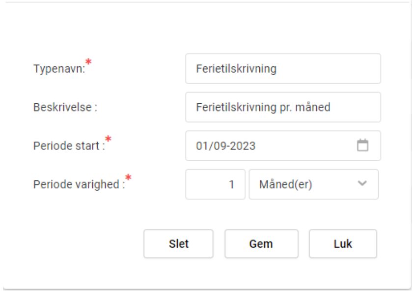 For perioden Ferietilskrivning skal ”’Periode start” skal være d. 1/9-2023 og periodens varighed skal være 1 måned: