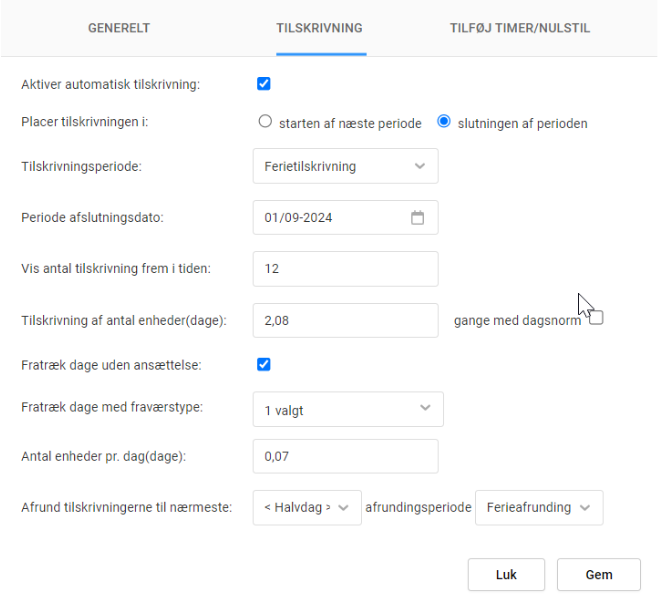 Dette hak sættes, hvis du ønsker, at der skal ske en automatisk tilskrivning/ optjening. Hvis hakket fjernes, vil historikken og de allerede tilskrevne dage/ timer bagud i tid blive liggende på saldoen, men, der vil ikke ske flere automatiske fremtidige tilskrivninger pr. efter den dato hakket er blevet fjernet.