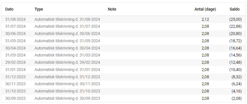 - Ferietilskrivning: Den løbende tilskrivning (de 2,08 dage pr. måned)