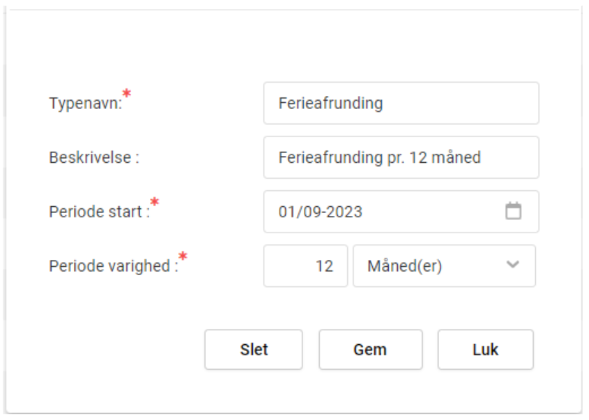 For perioden Ferieafrunding skal ”’Periode start” skal være d. 1/9-2023 og periodens varighed skal være 12 måneder: