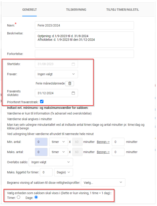 Ændrer du en saldo fra dage til timer eller omvendt, vil der ikke ske en konvertering af de tal, der allerede ligger på saldoen (med mindre at der ændres på enhedsparametrene også).