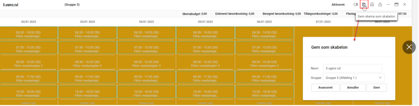 Når vagtplanen er færdig, gemmes denne som skabelon ved at klikke på disketten øverst højre hjørne.