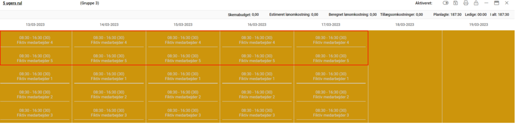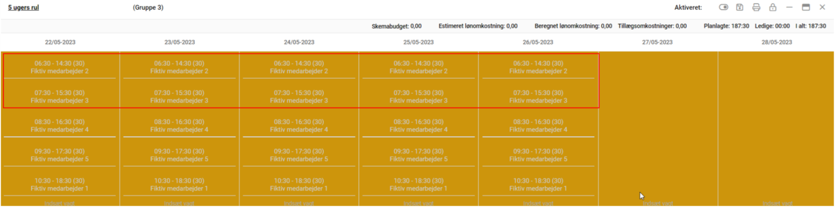 Skemaplanlægning benyttes til at oprette de ønskede vagtplaner. I dette eks. laves et 5 ugers rul, hvor de tidligere oprettede fiktive medarbejdere, skal tilknyttes.