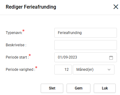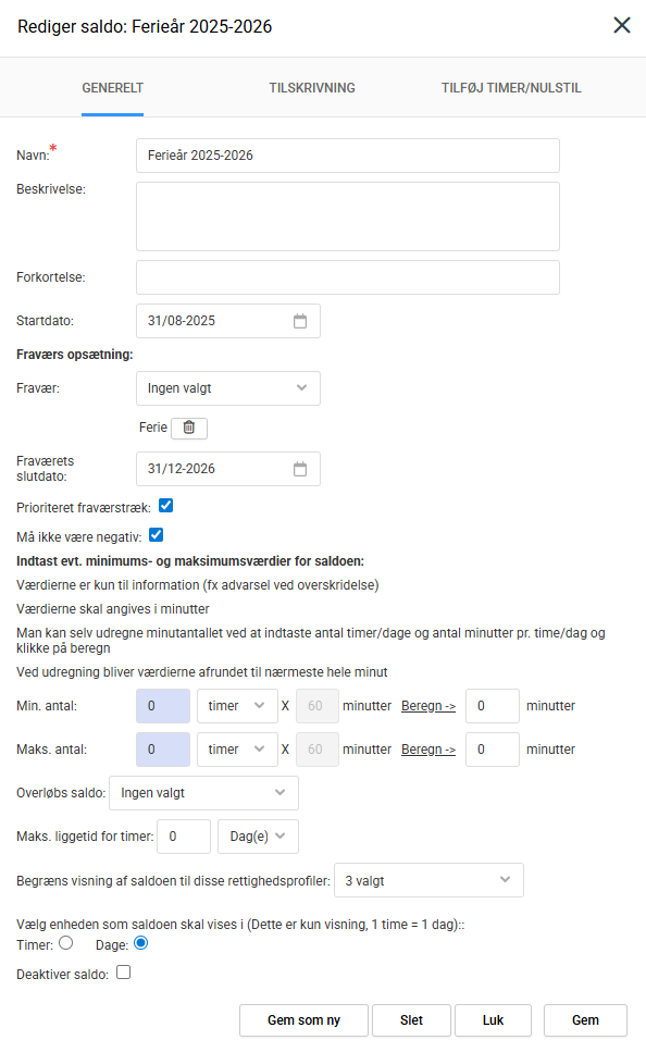 - Fraværets slutdato: angiver hvornår saldoen skal ophøre med at være aktiv. Hvis saldoen ikke skal have en slutdato efterlades dette felt blankt.