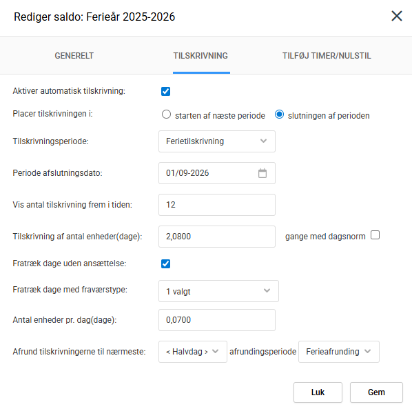 - Aktiver automatisk tilskrivning: sættes der hak her vil den automatiske tilskrivning blive aktiveret. Hvis hakket fjernes igen, vil historikken og de allerede tilskrevne dage/timer bagud i tid blive liggende på saldoen, men der vil ikke ske flere automatiske fremtidige tilskrivninger pr. efter den dato hakket er blevet fjernet.