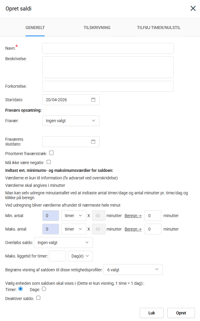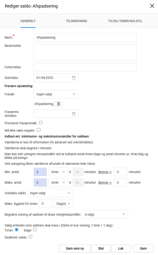 - Begræns visning af saldo: det er muligt at vælge hvilke rettighedsprofiler der kan se den pågældende saldo, således kan man begrænse visningen af saldi til bestemte medarbejdere.