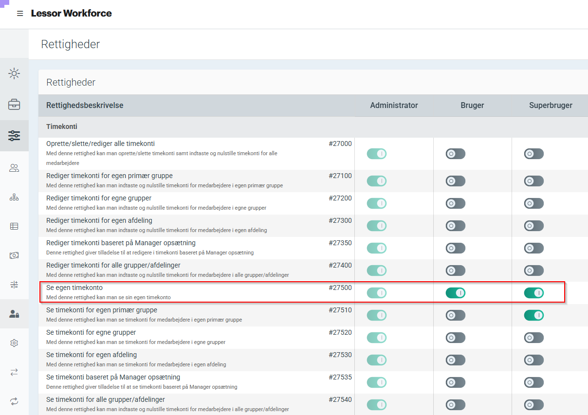 Medarbejdere kan ikke automatisk se og redigere saldi, det styres vha. rettigheder. For en medarbejder der kun skal kunne se sine egne saldi er det rettighed # 27500 der skal aktiveres