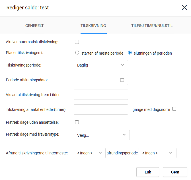 - Aktiver automatisk tilskrivning: sættes der hak her vil den automatiske tilskrivning blive aktiveret. Hvis hakket fjernes igen, vil historikken og de allerede tilskrevne dage/timer bagud i tid blive liggende på saldoen, men der vil ikke ske flere automatiske fremtidige tilskrivninger pr. efter den dato hakket er blevet fjernet.