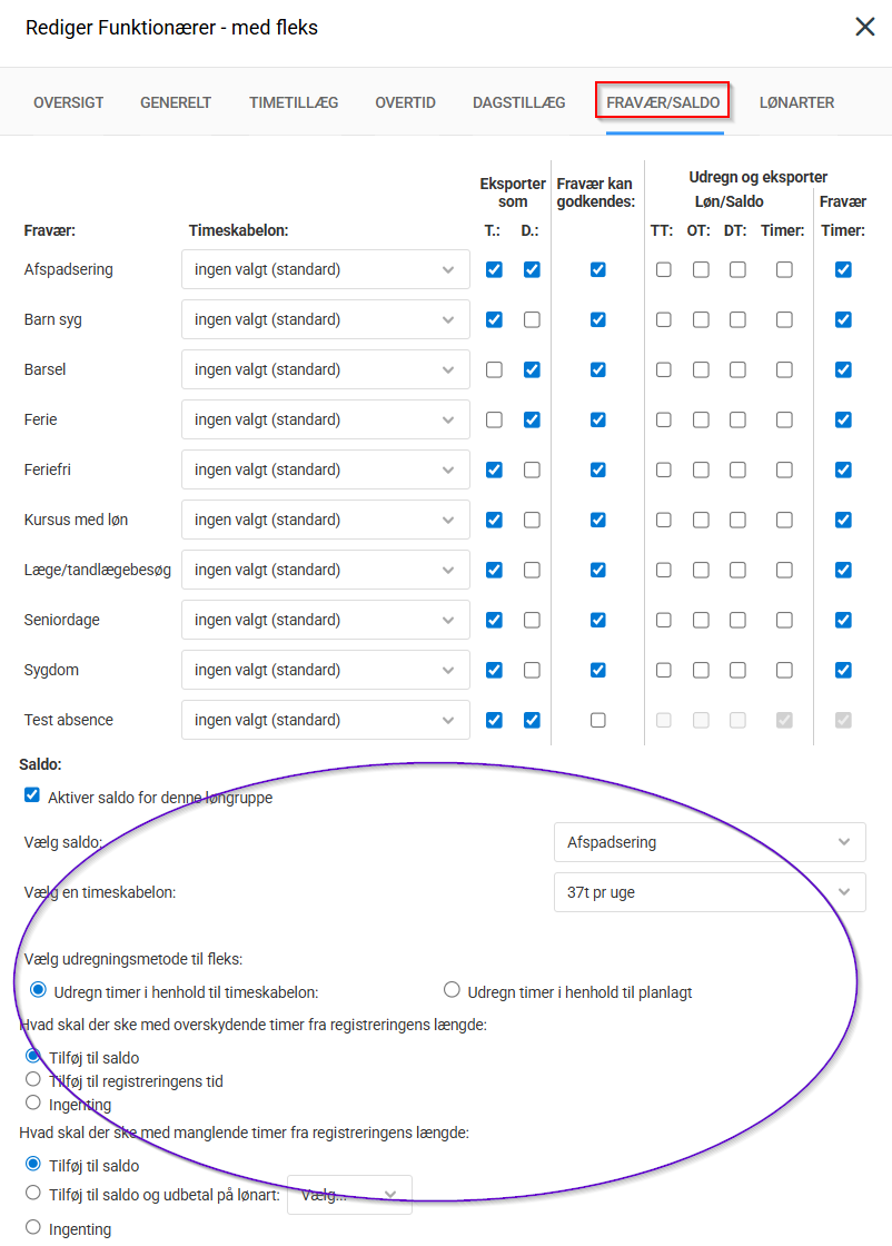 - Fratræk dage med fraværstype: hvis der er visse typer af fravær der medfører at en medarbejder ikke optjener på sin saldo angives de her.