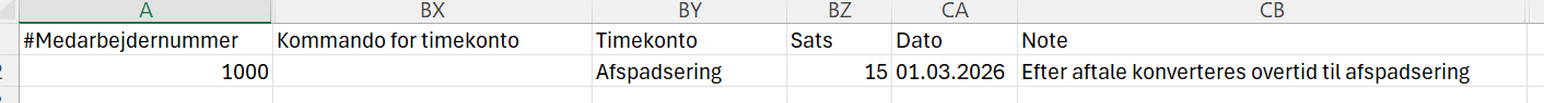 I ovennævnte eksempel indlæses 15t på medarbejder 1000 den 1/3-2026. Note og kommando er ikke obligatoriske felter, men udfylder du ikke kommandoen vil satsen blive tilføjet saldoen.