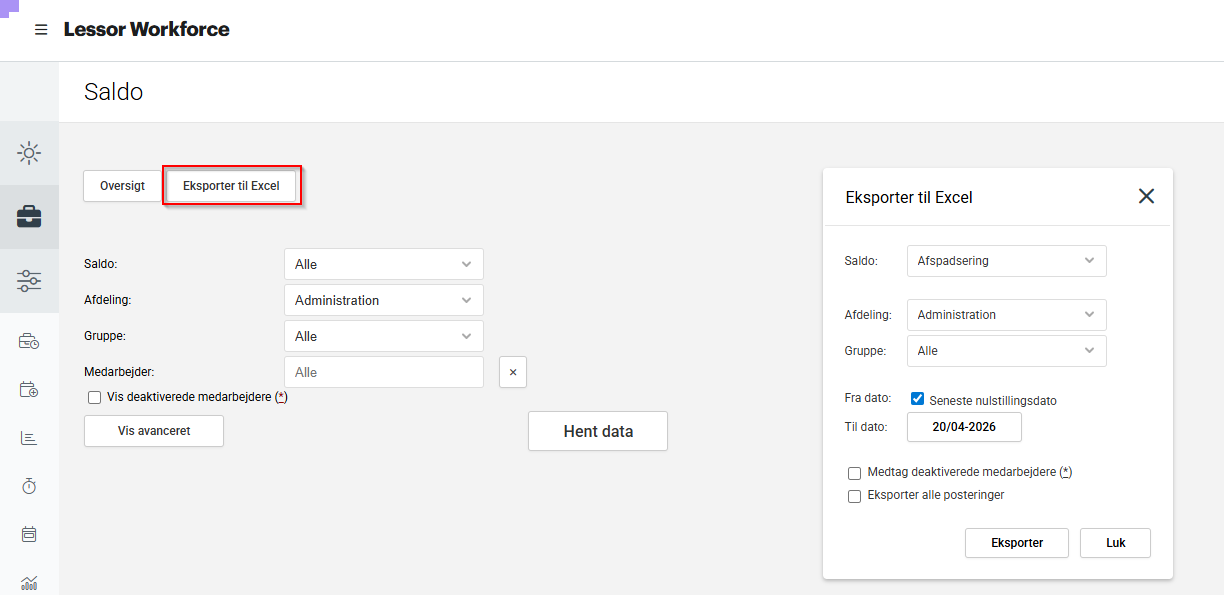 På siden Saldo er det muligt at klikke på fanen Eksporter til Excel og få saldi-bevægelser i en excel-fil.