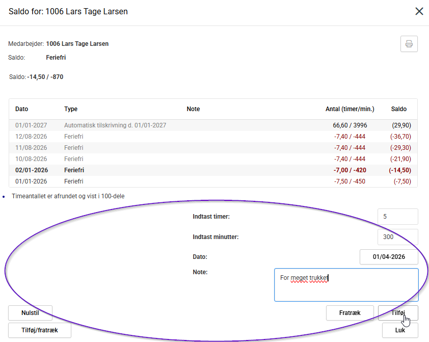 Hvis du klikker på "tilføj/fratræk" foldes nederste del ud og du kan nu tilføje eller fratrække timer fra kontoen. Her fratrækkes 5 timer per 1/4-2026:
