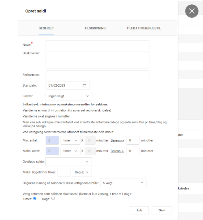 | Begræns visning af saldo | Her vælges hvilke rettighedsprofiler der skal have adgang til at se netop denne saldo. Dette slår også igennem i app’en. I Timeregistrering vil du kunne se +/- tal, men ikke have mulighed for at åbne saldoen |