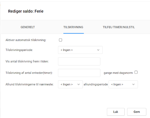 | Aktiver automatisk tilskrivning | Dette hak sættes, hvis du ønsker, at der skal ske en automatisk tilskrivning/optjening. Hvis hakket fjernes, vil historikken og de allerede tilskrevne dage/timer bagud i tid blive liggende på saldoen, men der vil ikke ske flere automatiske fremtidige tilskrivninger pr. efter den dato hakket er blevet fjernet. |