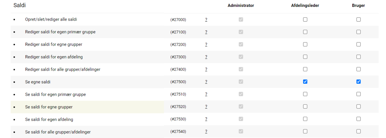 Under Rettigheder opsættes den enkelte rettighedsprofil. Rettighederne fra #27000 til #27540 vedrører visning og rettigheder til brug af Saldi.