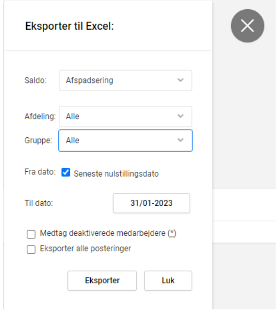 | Medtag deaktiverede medarbejdere | Hvis deaktiverede medarbejdere skal medtages i eksporten |