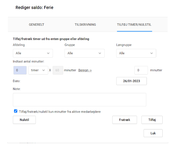 | Tilføj/fratræk/reset kun minutter fra aktive medarbejdere | Mulighed for at angive om inaktive medarbejdere skal med i ændringen af saldoen |