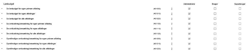 For at gøre brug af Lønbudget skal rettighederne for de forskellige rettighedsprofiler tilpasses under Opsætning, Rettigheder, Lønbudget
