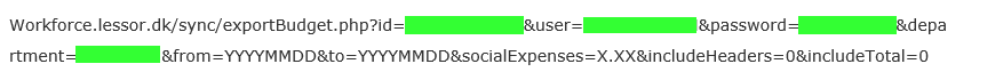 Workforce.lessor.dk/sync/exportBudget.php?id=DATABASE_ID&user=BRUGERNAVN&password=PASSWORD&department=AFDELING&from=YYYYMMDD&to=YYYYMMDD&socialExpenses=X.XX&includeHeaders=0&includeTotal=1