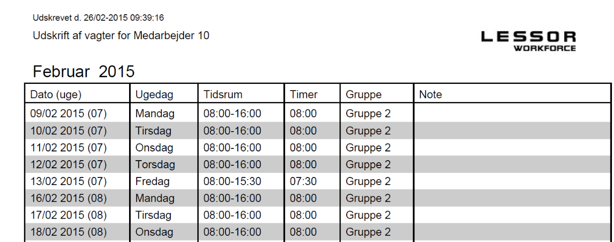 | Inkluder noter | Hvis afkrydset udskrives vagtnoter |