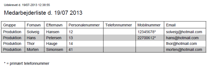 | Inkluder telefonnummer | Hvis afkrydset udskrives medarbejderens telefonnummer. Hvis kun ét nummer er udfyldt, udskrives dette. Hvis både mobiltelefonnr. og telefonnr. er udfyldt, udskrives telefonnr. Hvis et af disse er markeret som primær, udskrives dette. |