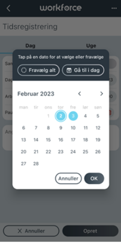 Hvis du trykker på datoen, vil du kunne vælge en anden dato for din registrering, eller multiselect på flere dage. Gør du det, vil du kunne oprette identiske registreringer på de valgte dage.