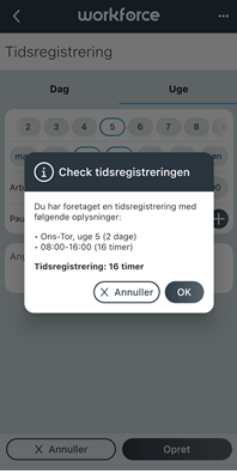 Når du trykker Opret, ligesom under Dag, vil du blive præsenteret for en opgørelse af hvad du er ved at oprette. Ønsker du ikke at sende registreringen igennem skal du trykke på Annuller.