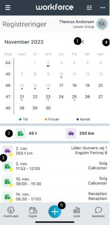Fra filteret øverst i højre hjørne (4) kan du filtrere på registreringer, hvis du fx udelukkende ønsker at se dine vagter, dit fravær eller dine kørselsregistreringer i listen af registreringer. Fra kalender-knappen til venstre for filter-knappen har du mulighed for at definere din egen periode du ønsker at se registreringer for.