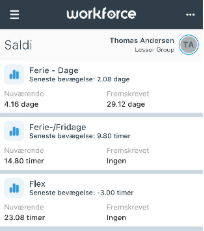 Fra Saldi kan du følge saldi på de timekonti, du er oprettet med – det kan være saldo på afspadsering, flextid, ferie eller feriefridage: