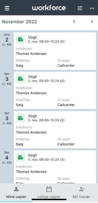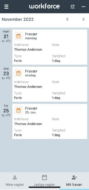 Listevisningen er delt op i Mine vagter, Ledige vagter og Mit fravær.