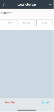 Fra plusset nederst (5) kan du fra Fravær oprette/ anmode om fravær fx ferie, feriefri eller afspadsering Vælg enten Timer (fra- og til-tidspunkt vælges), Hel dag (dato vælges) eller Dage (vælg fravær startdato og slutdato):