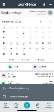Øverst vises navnet på den bruger, der er logget på app’en, og navnet på den virksomhed, der arbejdes i. Under dagens vejrudsigt vises denne måneds vagter, fravær og eventuelle kørselsregistreringer i et kalenderoverblik, hvor aktuelle vagter, fravær og kørselsregistreringer er markeret med en henholdsvis lyseblå, rød og grå prik under de enkelte dage. Ved at trykke på kalenderen kommer du ind på den aktuelle uges ugekalender, hvor du kan trykke på de enkelte dage i ugen og se vagter eller bladre frem en uge ad gangen.