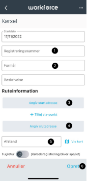 En ny kørselsregistrering oprettes ligeledes fra plusset. Hvis datoen ikke er dags dato, ændres den, og feltet Registreringsnummer udfyldes. Feltet Formål er også obligatorisk, og en eventuel beskrivelse lægges i feltet Beskrivelse. Felterne Angiv startadresse, Angiv slutadresse og Afstand udfyldes, og ønsker du at oprette en retur-registrering, kan dette slås til. Tryk på Opret og kørselsregistreringen er klar til godkendelse hos din leder: