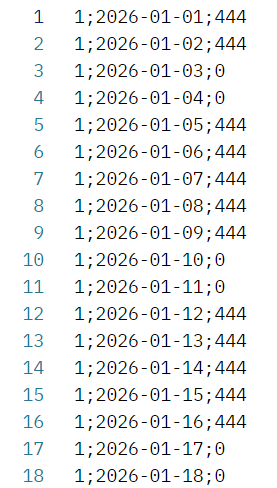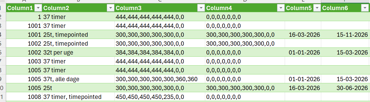 | Normtid (alm.) | Numerisk | Viser normtiden per dag man-søn, adskilt af komma | Ja, weeklyNorm |
