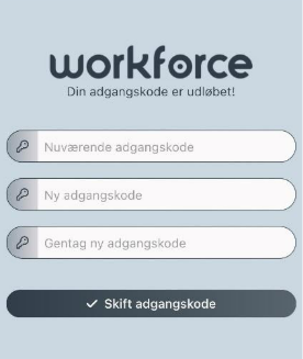 Hvis du er ny LessorWorkforce-bruger, har du modtaget et login (brugernavn og adgangskode) fra din leder. Du skal indtaste login som beskrevet ovenfor. Du skal nu lave din egen adgangskode. Skriv den adgangskode, du har modtaget fra din leder, i feltet Nuværende adgangskode og indtast din egen nye adgangskode i felterne Ny adgangskode og Gentag ny adgangskode. Din nye adgangskode skal være på mindst 8 karakterer, indeholde mindst ét stort bogstav, ét lille bogstav samt et tal.