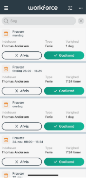 Fra Anmodninger kan du håndtere medarbejdernes anmodninger om vagter og fravær. Anmodningerne kan du se i en liste, og har du behov for at filtrere på enten vagter eller fravær, kan du gøre det ved at trykke på søge-ikonet nederst og herefter vælge filteret. Herfra vil det også være muligt at søge fx på et medarbejdernavn: