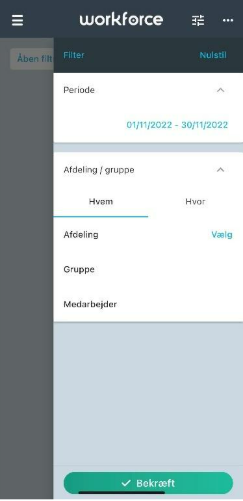 Fra Godkend registreringer kan du godkende komme/ gå stemplinger, fravær og kørselsregistreringer. Start med fra filtret øverst til højre at vælge hvilken periode du vil godkende for samt hvilke afdelinger/ grupper/ medarbejdere du vil godkende for – efter valget trykkes ”Bekræft”: