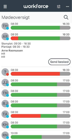 - Er stemplet ind på sin planlagte vagt (grøn markering på medarbejder) men er stemplet ind for sent (statusbar rød fra planlagte vagts starttidspunkt frem til indstemplingstidspunkt – herefter er statusbar grøn)