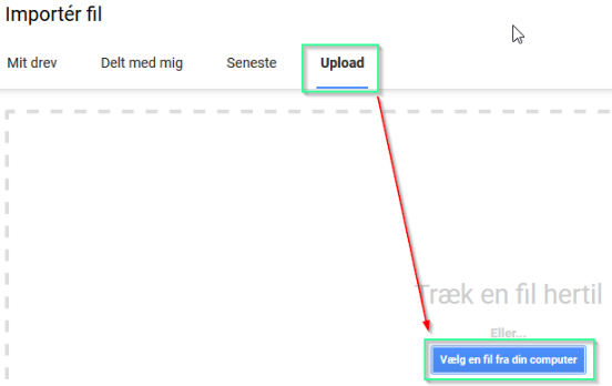 c. Vælg herefter Upload -> Vælg en fil fra din computer og find nu filen