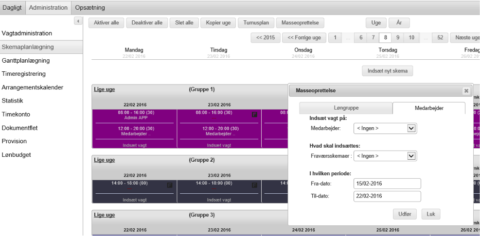 Det er muligt at indsætte fravær, på en medarbejder eller en hel løngruppe, ved brug af Masseoprettelse. Denne indsættelse kan begrænses til kun at gælde dage hvorpå der planlagte vagter.