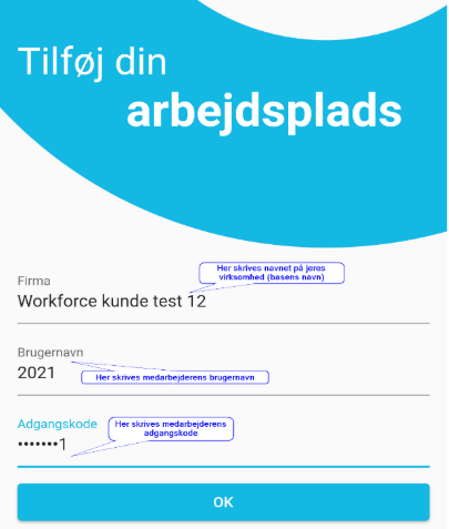 Bemærk! Er det første gang du logger ind i Workforce er det en engangs-adgangskode du har og du bliver bedt om at indtaste en ny adgangskode. Derefter skal bruge den netop valgte adgangskode til at logge på app’en.