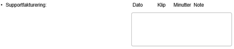 | Supportfakturering | Viser hvilke perioder, der er faktureret for samt antal klip. Det er afregningen for konsulentydelser, timer og kørselstid. Ikke kilometer penge. Der afregnes 30 klip pr. time. Ved at holde musen over teksten i Note, er det muligt at se flere detaljer |